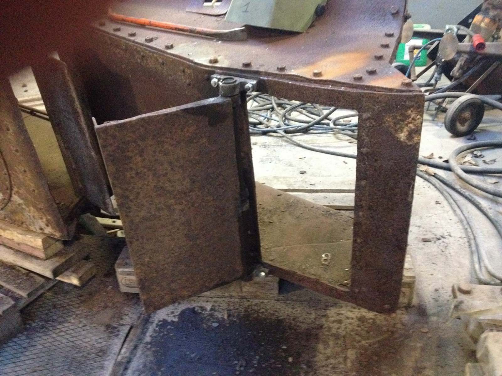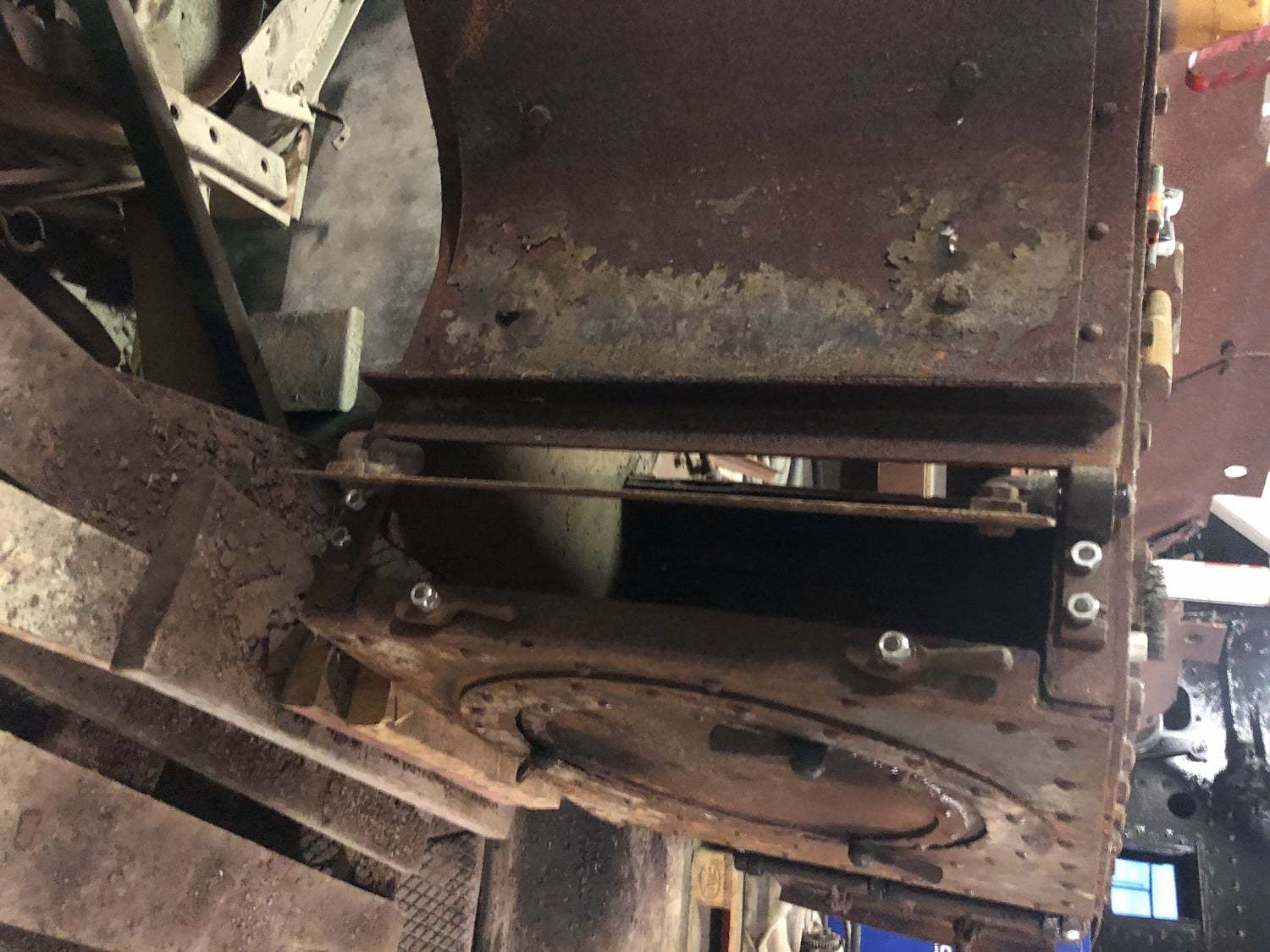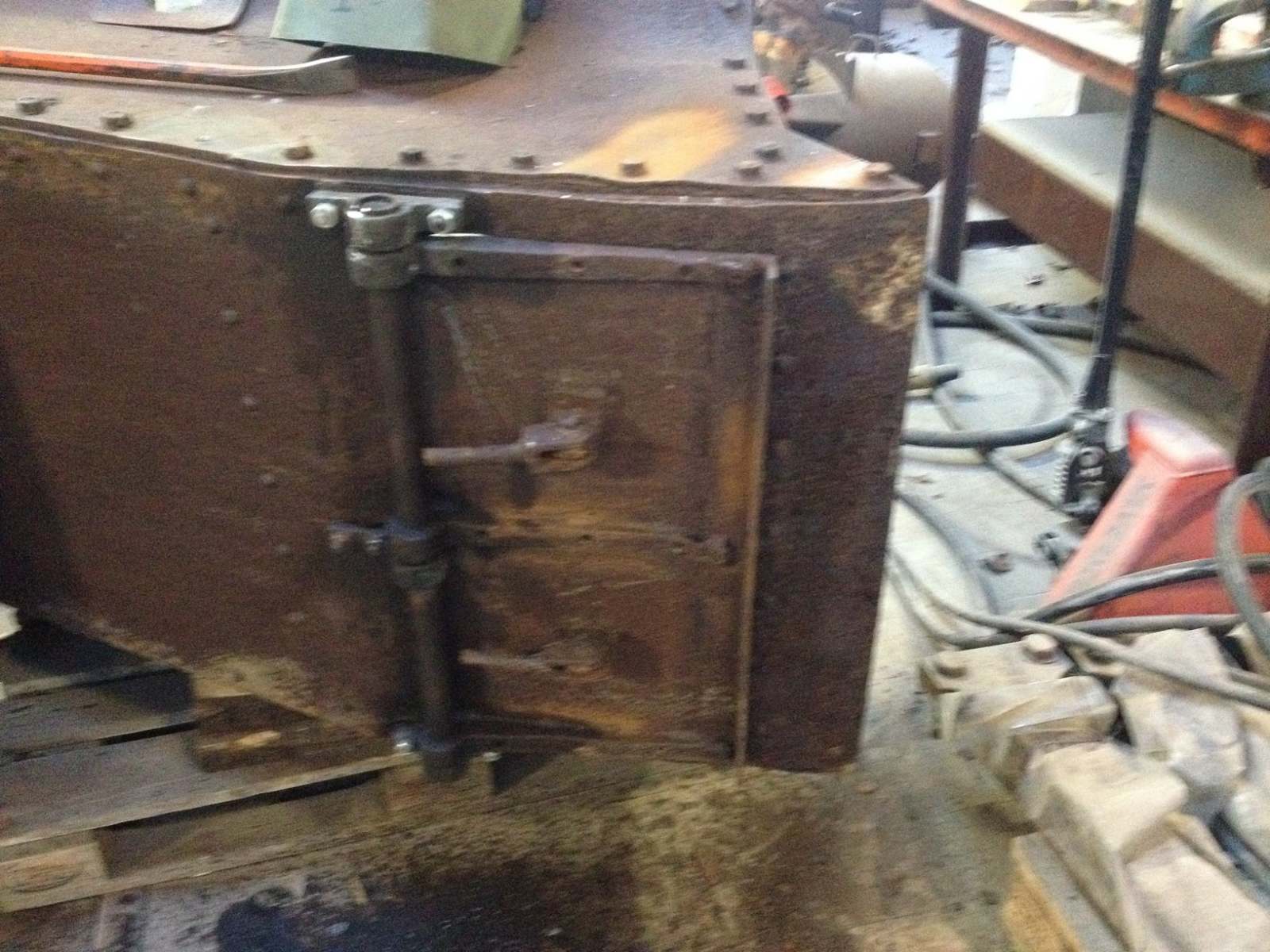 Ellers fortsatte dagens arbejdsdag med at løsne mandehullet og den forreste vandrette askekasseklap. Førstnævntes vridere måtte ”overtales” med lidt varme, mens klappen måtte varmes, hvorefter vi kunne skille hængslerne ad. Alting blev renset for rust og støv og smurt, hvorefter hængslerne fungerede fint. Desværre kunne den stadig ikke åbnes og lukkes nemt efter genmontage. Det viste sig, at hele arrangementet var blev skævt igennem tiden, men takket være Oles og Peders gode råd fik vi rettet hængslerne og akslen, hvorefter også denne klap kører som ønsket. Godt man kan trække på Oles og Peders erfaringer fra en længere karriere som smed m.v.
