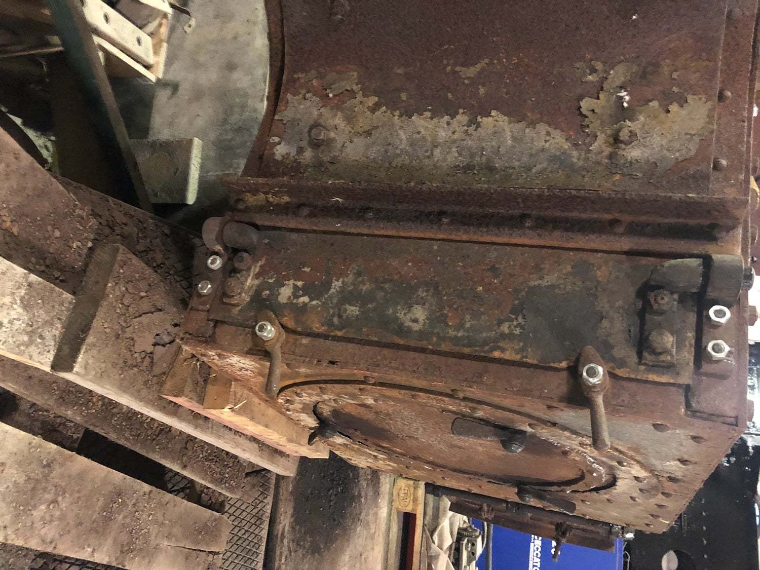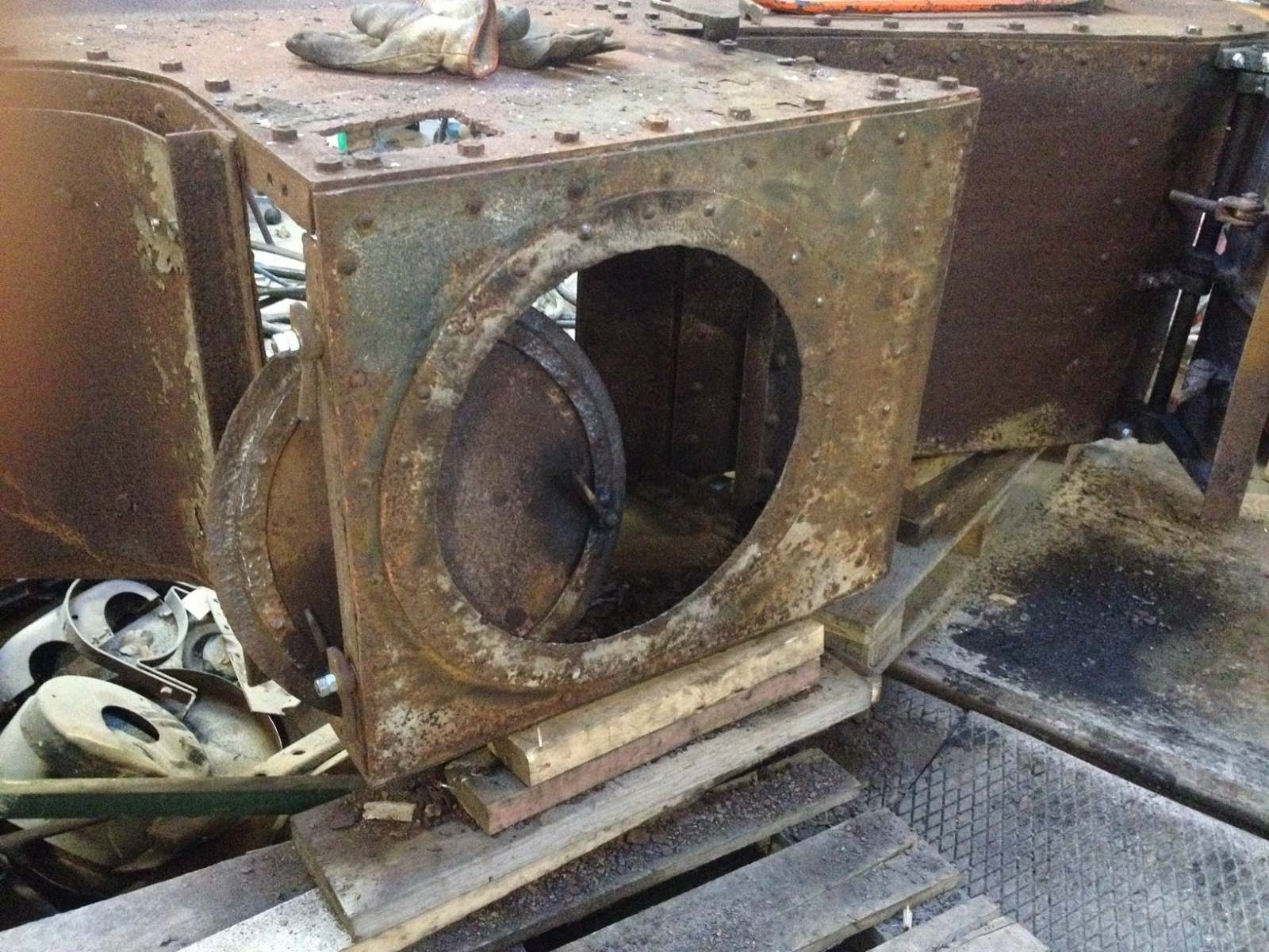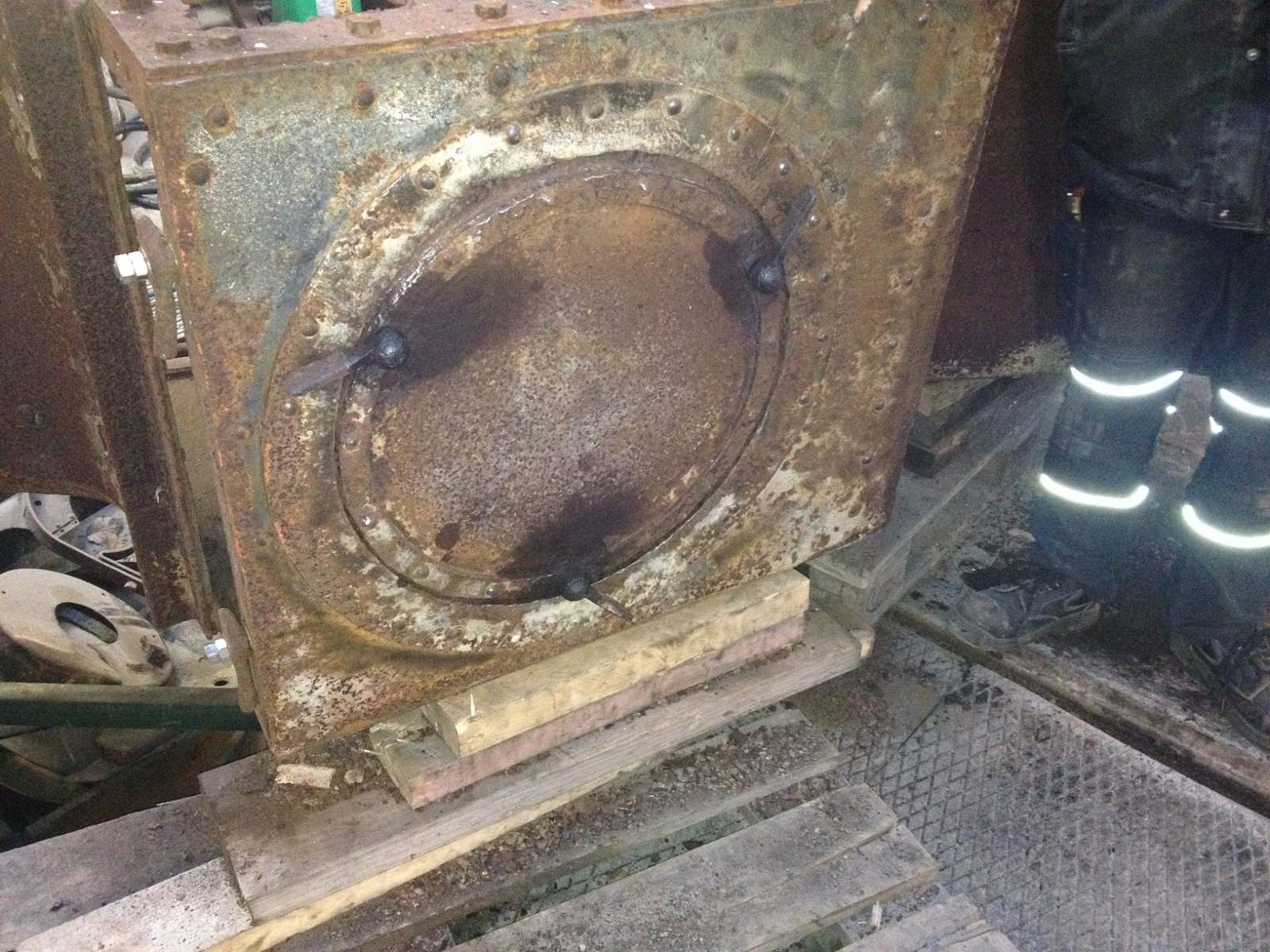 Ellers fortsatte dagens arbejdsdag med at løsne mandehullet og den forreste vandrette askekasseklap. Førstnævntes vridere måtte ”overtales” med lidt varme, mens klappen måtte varmes, hvorefter vi kunne skille hængslerne ad. Alting blev renset for rust og støv og smurt, hvorefter hængslerne fungerede fint. Desværre kunne den stadig ikke åbnes og lukkes nemt efter genmontage. Det viste sig, at hele arrangementet var blev skævt igennem tiden, men takket være Oles og Peders gode råd fik vi rettet hængslerne og akslen, hvorefter også denne klap kører som ønsket. Godt man kan trække på Oles og Peders erfaringer fra en længere karriere som smed m.v.