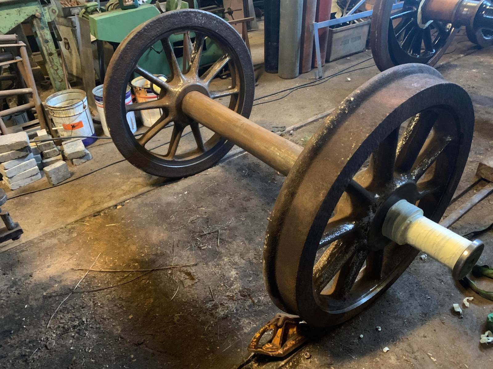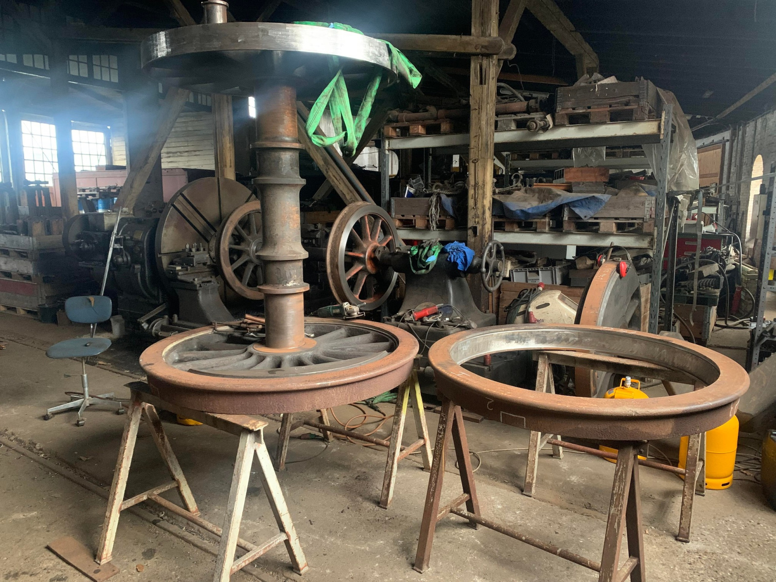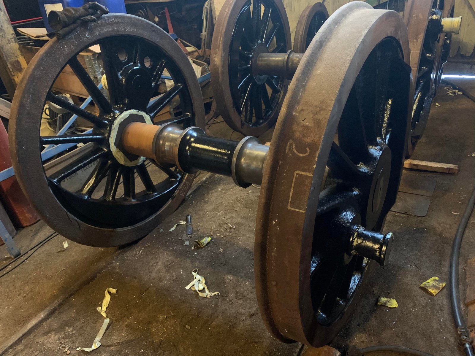 Det store spørgsmål var for os, om lokomotivets hjul og den 4. tenderaksel nåede at få monteret nye bandager, få en profilafdrejning og lande i Gedser inden årets udgang. Det må vi nok sande, at vi ikke når. Til gengæld har vi været på besøg hos Limfjordsbanen i Aalborg i mandags den 12.12.22 og fik det positive indtryk, vi havde håbet på. Tenderaksel 4 og halvdelen af lokomotivets aksler HAR fået påkrympet deres respektive nye bandager og monteret sprængringe. Der mangler således kun 2 aksler, før alle hjul skal afdrejes i profil, hvorefter de alle sammen er klar til afhentning. Glenn ved godt at det er yderst vigtigt, at hjulene på alle 4 lokomotivaksler har samme diameter, da de er forbundet med drivstænger. Er der afvigelser, slider det på stænger og hjul.