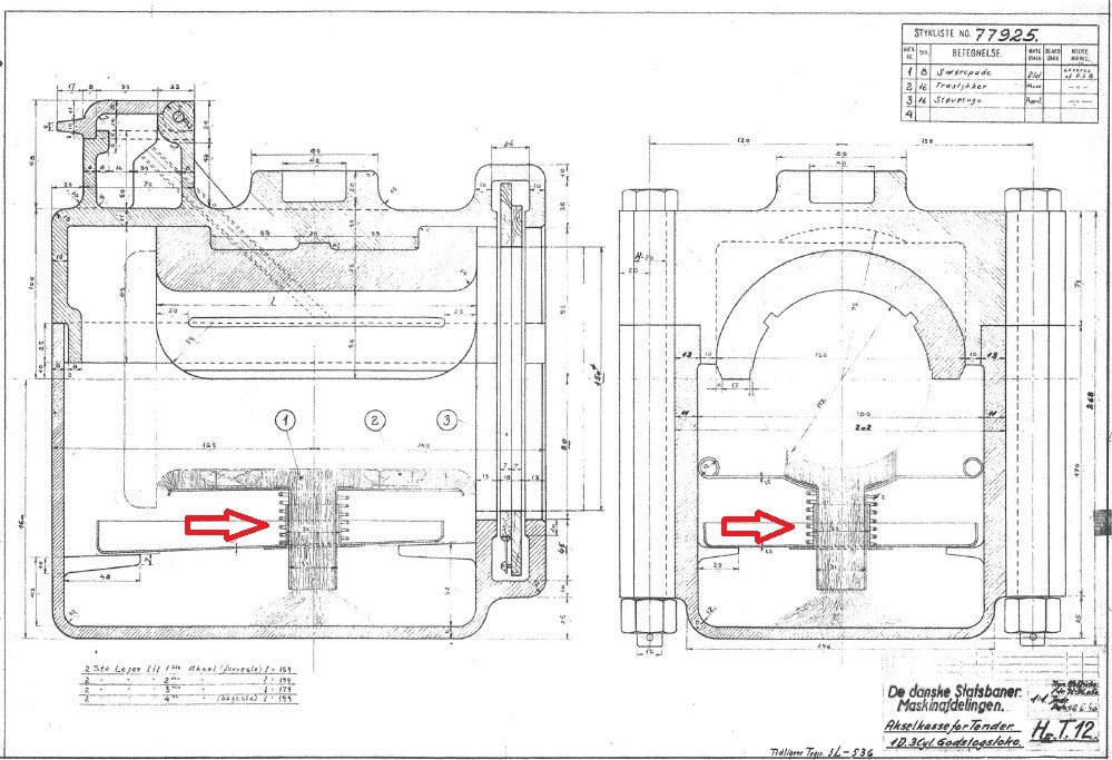 En anden ting, der skal bruges til akselkasserne er 7 stk. fjedre, der presser smørepuden op mod sølen og således er en vigtig ting af lejesmøringen. Sidste arbejdsdag fandt vi en enkelt af disse fjedre, vi ønskede at genbruge. Den sidder nu på sin plads i den første akselkasse, vi fik monteret. Resten har set bedre dage. I øjeblikket er vi ved at få en fjederfabrik til at producere nye og også disse nye fjedre regner vi med kommer til Gedser mellem jul og nytår. På tegningen kan ses en akselkasse – fjederens placering er markeret med rød pil.