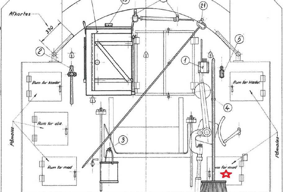 I tenderforvæggen er der placeret 5 rum til olie, lkf’s tøj, mad samt fyrbøderens tøj og mad. På vedhæftede tegning kan ses placeringen af disse skabe. Da førerpladsen ikke er helt tæt mod vind og regn, er der placeret en slags tagrende over hert skab, så eventuelt vand ikke løber ind i skabene. Fyrbøderens madskab (markeret med rød stjerne) manglede denne tagrende – så den fik vi produceret og monteret. Så provianten til den hårdt arbejdende kollega også fremover holder sig tørt.