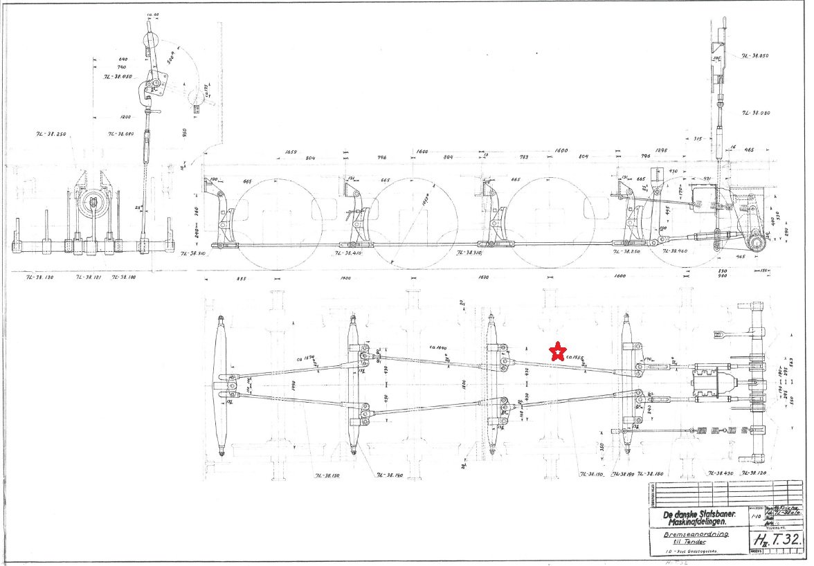 Pludselig dukkede Thomas op med en næsten færdig bremsestang som han har produceret for os, idet vi ikke fik den sidste af tenderens bremsestænger med fra Roskilde. Jeg vedhæfter tegning over ”bremsearrangement for tenderen”, der viser bremsestængernes placering. Når der bremses hiver bremsecylinderen via en stang i styrebukken, der bl.a. er forbundet med et sæt bremsestænger – et sæt i hver side. Disse bremsestænger flytter bremsetraverserne og dermed bremsehængere og bremseklodser fremad, hvorved bremsevirkningen opnås.