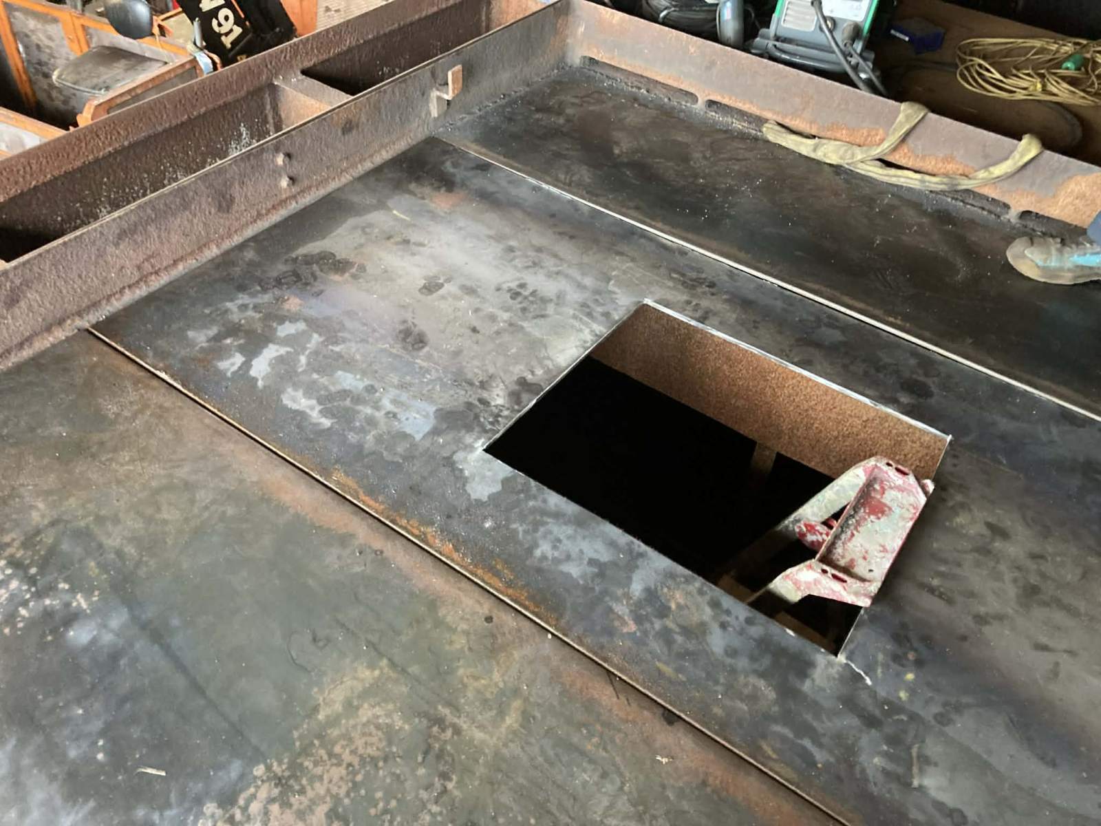 Som i husker er vi ved at lukke det bageste store hul over vandkassen. Hullet måtte vi skære, fordi der ikke var meget tilbage af de gamle 10mm plader, der udgjorde dækket fra ny. Af logistiske årsager kunne vi ikke få én enkelt plade på 3000x3000mm, men måtte dele den op i 3 plader, hvis kanter hviler på de øverste afstivninger, som også danner en udmærket base til at svejse dem sammen på. Den forreste fik vi svejst på sidst, den bageste blev hæftet og den sidste blev skåret til på mål og løftet op med troljekranen. Alt i alt godt 400kg jernplader………
