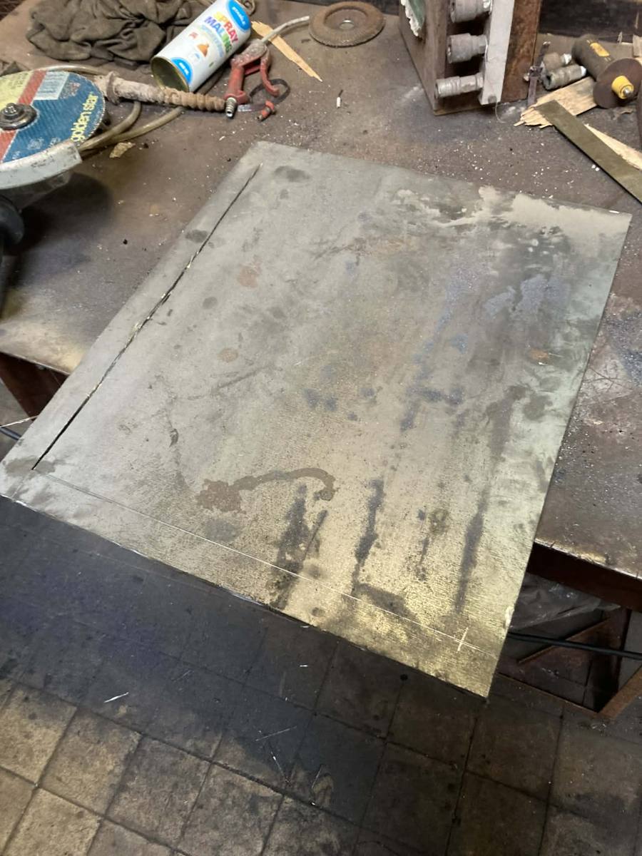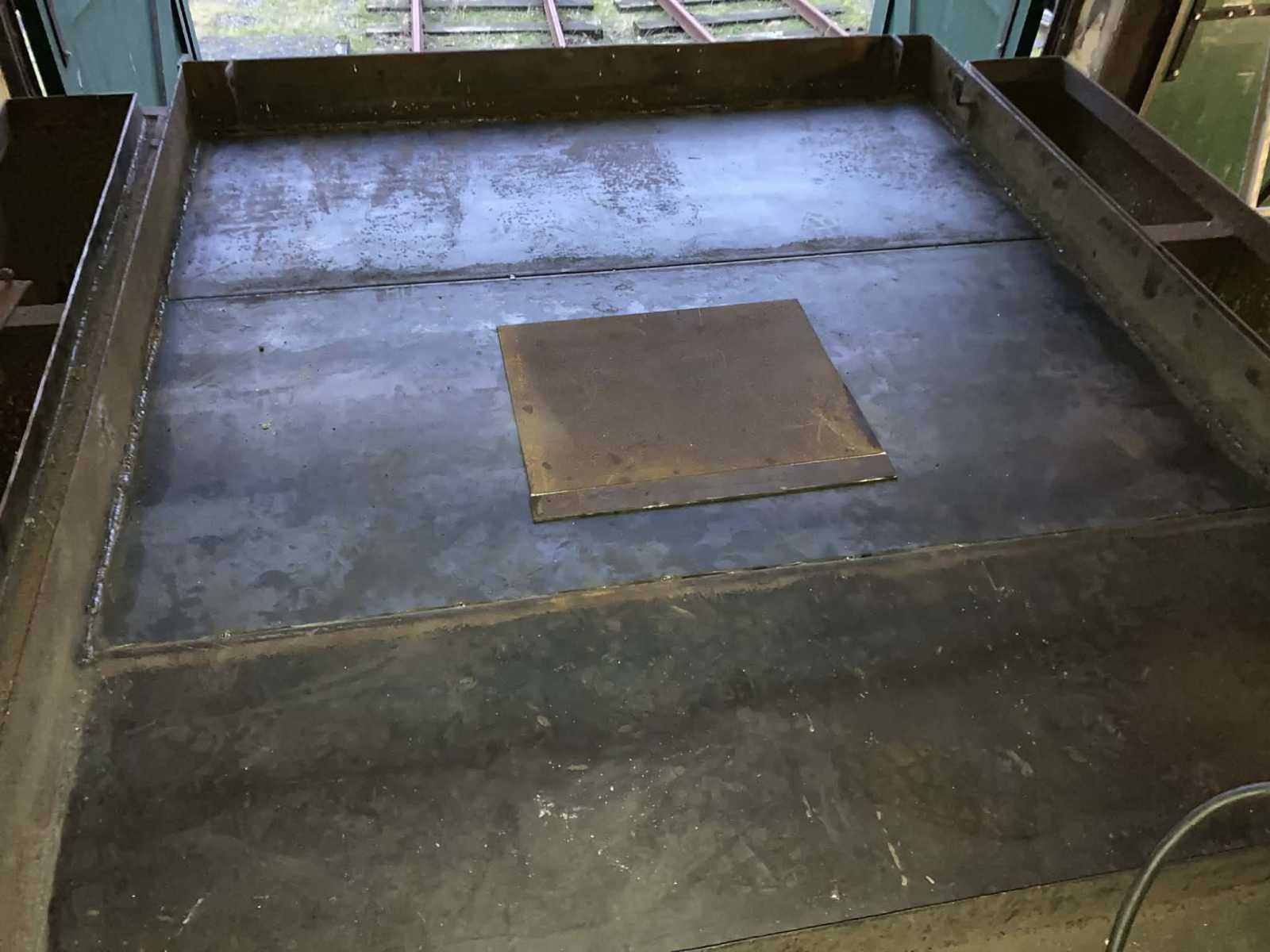 Jeg selv gik i gang med at lave dækpladen til mandehullet. Iflg. Frichs’ tegninger afstives pladen af noget 10mm fladjern hele vejen rundt. Vi har ikke fladjern på lager men fremstillede afstivningen af det stykke, vi havde skåret ud af dækpladen. Bagefter blev selve pladen skåret ud af 6mm plade og afstigningen hæftet under denne – ganske som Frichs gjorde i 1941. Pladen blev færdig og passer som ønsket. Næste gang skal vi sætte gevindstykker i dækpladen den skal passe på, svejse og fiksere dem fast nedefra, bore passende huller i pladen samt montere to håndbøjler og vupti: Så skulle den være klar.