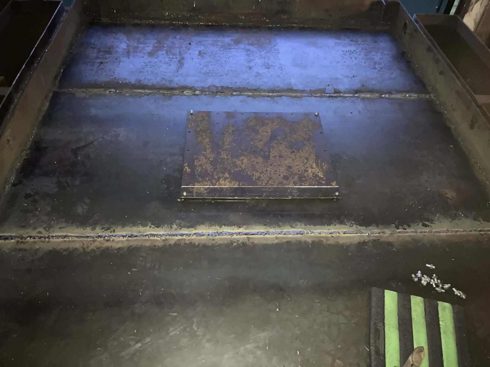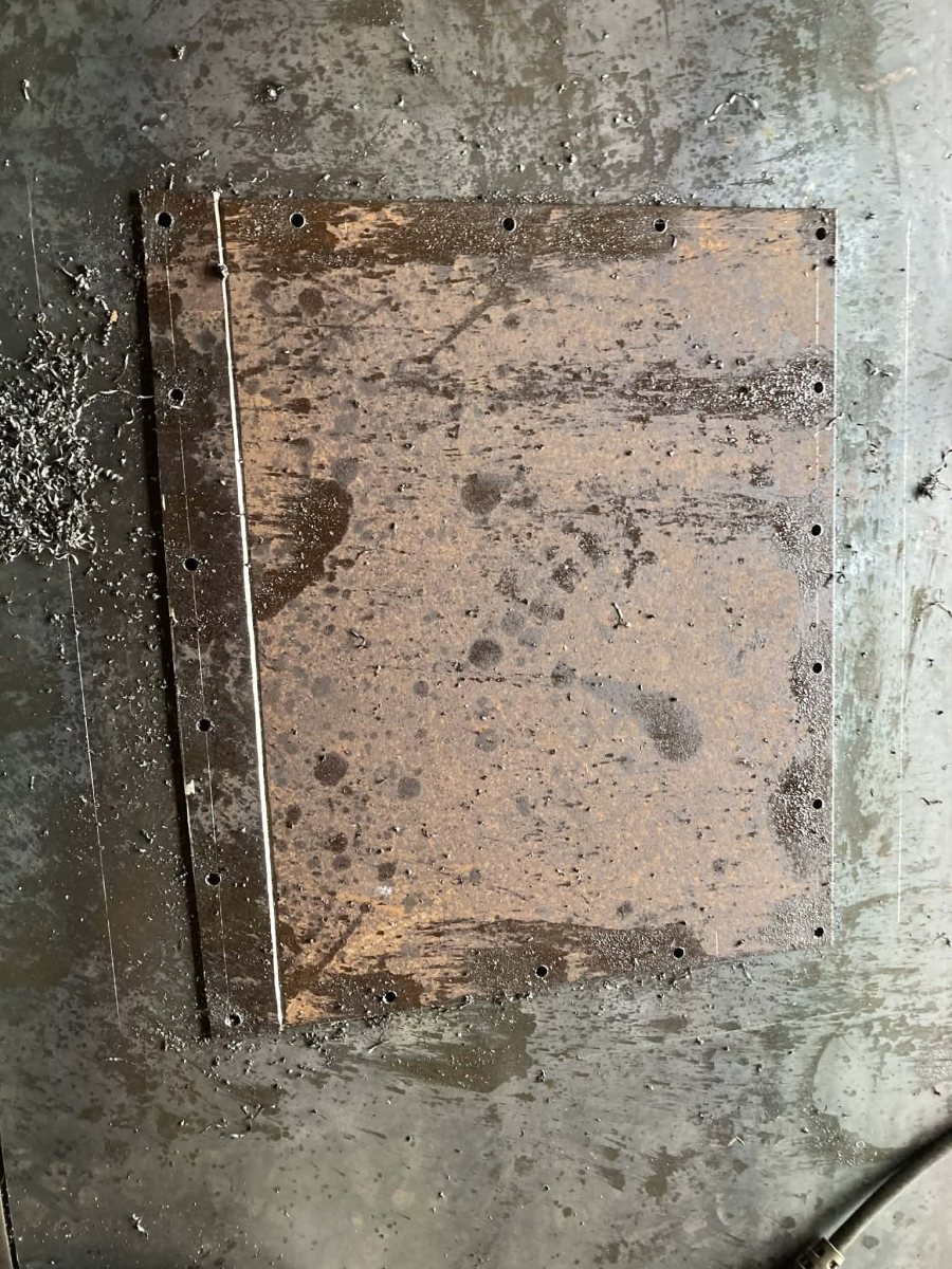 Herefter blev 18 stykker 10mm gevindstang skåret i 30mm’s længde. Vi nåede at sætte 4 stk gevindstænger i hjørnehullerne og svejste dem fast nedefra. Så er hullerne vandtætte og gevindstængerne, der sammen med de kommende yderligere 14 stk kommer til at holde låget på plads.