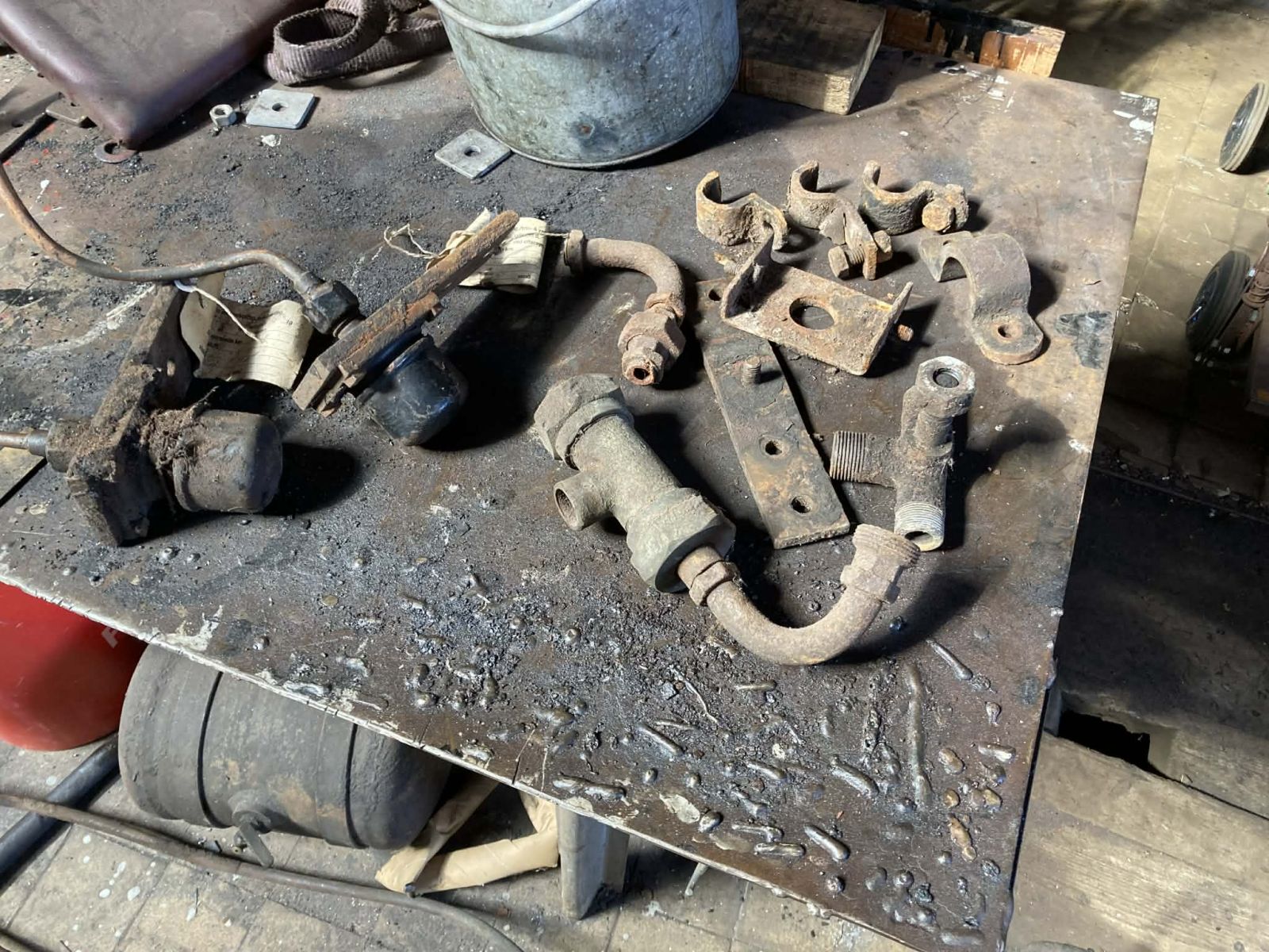 Med troljen var væk fra graven i spor 2 kravlede vi ned og fandt adskillige rør, beslag og ophæng til vores trykluftprojekt. Vi har ikke det hele men vil nu ved hjælp af tegningerne kunne bestemme, hvad vi har og hvad vi mangler: Der er flere grave med dele.